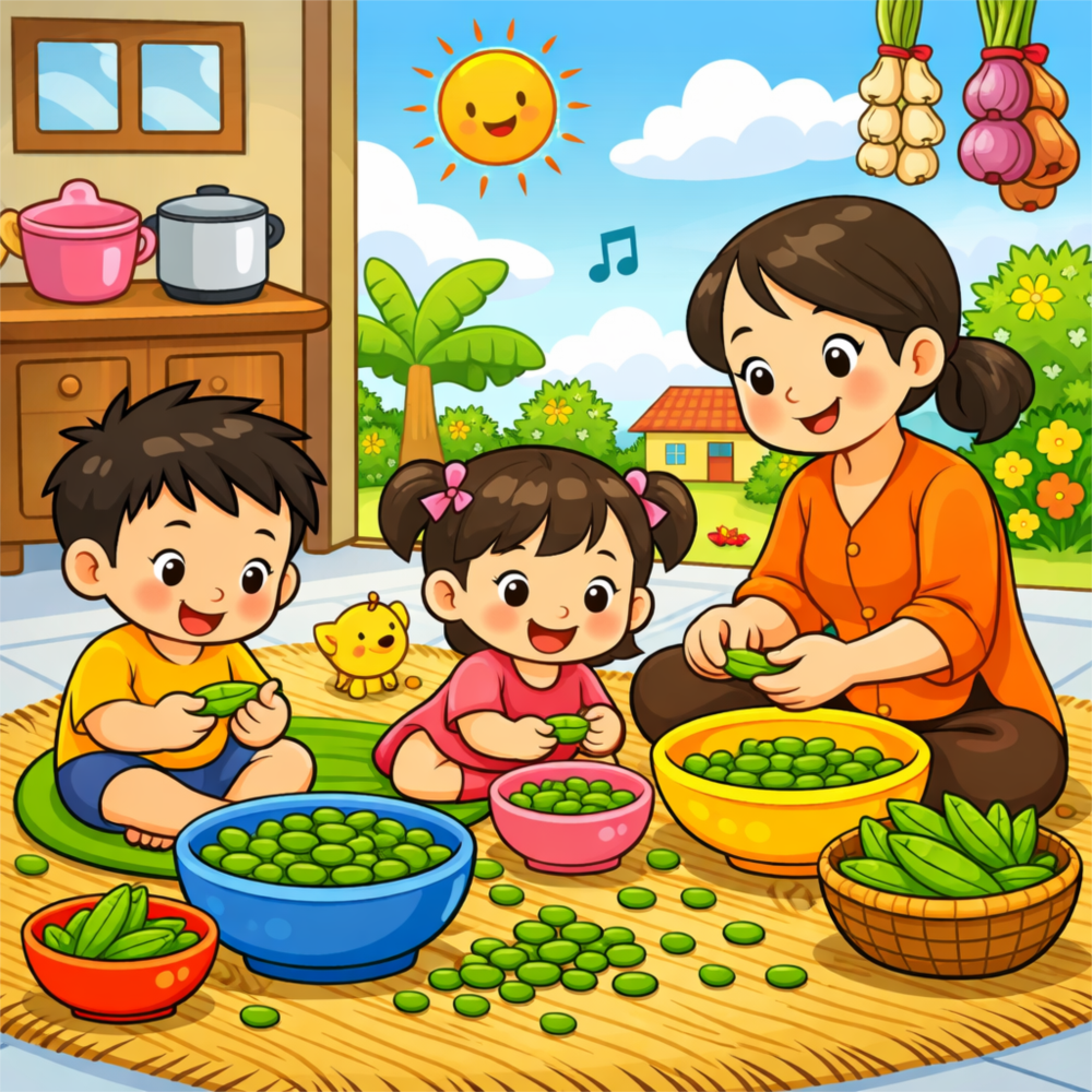 Hôm nay lớp Nhà trẻ B rộn ràng tiếng cười khi các bé cùng tham gia hoạt động làm đỗ giúp mẹ. Những đôi bàn tay bé xíu vừa tò mò vừa thích thú, nhẹ nhàng nhặt từng hạt đỗ cho vào rổ như những “người phụ mẹ tí hon”.